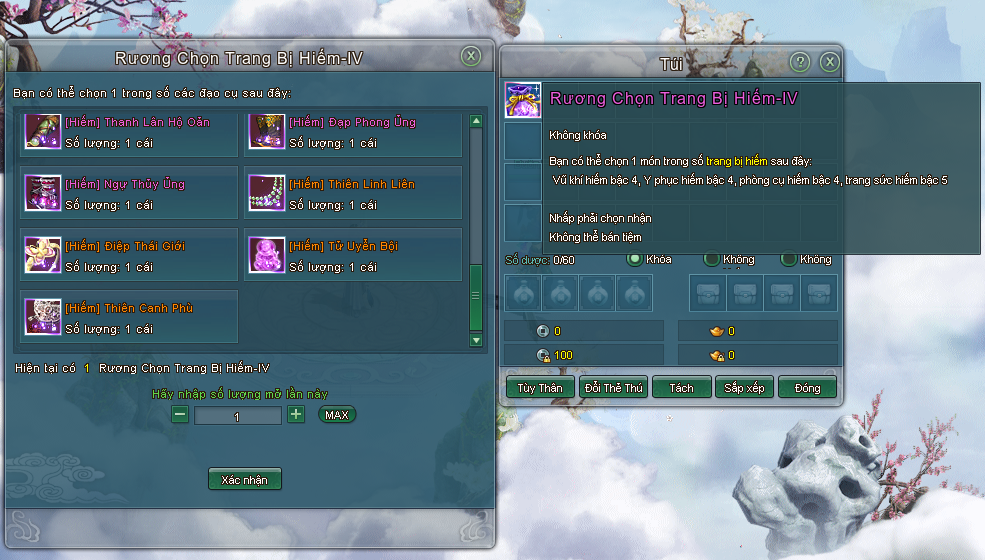 Vật phẩm "Rương Chọn Trang Bị Hiếm-IV" mở ra có thể tùy chọn 1 trang bị sau: Vũ khí hiếm bậc 4, Y phục hiếm bậc 4, Phòng cụ hiếm bậc 4, Trang sức hiếm bậc 5.