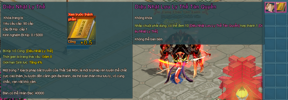 - Dùng 10 Diệu Nhật Lưu Ly Thể Tàn Quyển để ghép thành bí tịch Diệu Nhật Ly Thể.