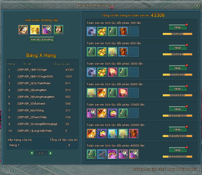 - Tổng lượt Quay Vòng Quay của server đạt mốc chỉ định, tất cả người chơi tại server đó được nhận quà.