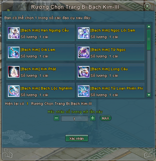 - Mở "Rương Chọn Trang Bị Bạch Kim" được chọn 1 trong các loại Vũ khí; Y phục; Trang sức; Phòng cụ Bạch Kim.