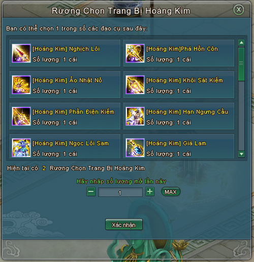 - Mở "Rương Chọn Trang Bị Hoàng Kim" được chọn 1 trong các trang bị Hoàng Kim sau: