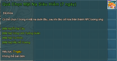 - Mở "Quà Chọn Mặt Nạ Siêu Hiếm (7 Ngày)" được chọn 1 trong các loại mặt nạ siêu hiếm có chỉ số.