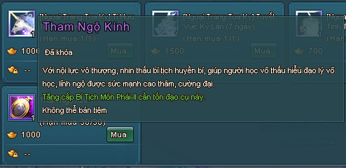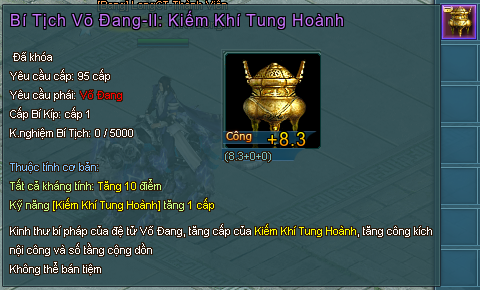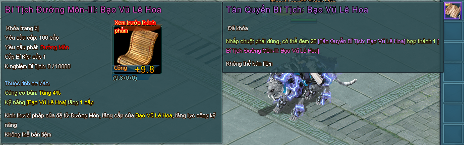 - Dùng 20 Tàn quyển kỹ năng môn phái cấp 100 để ghép thành bí tịch kỹ năng hoàn chỉnh.