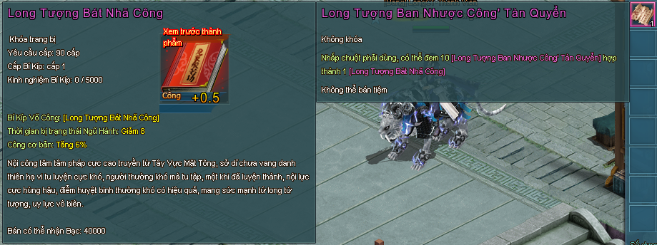 - Dùng 20 Long Tượng Ban Nhược Công - Tàn Quyển để ghép thành bí tịch Long Tượng Bát Nhã Công