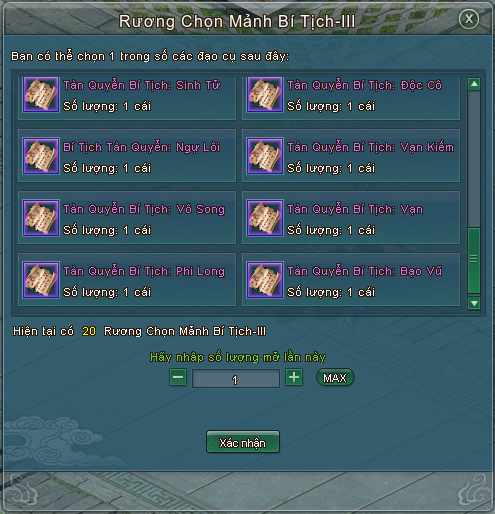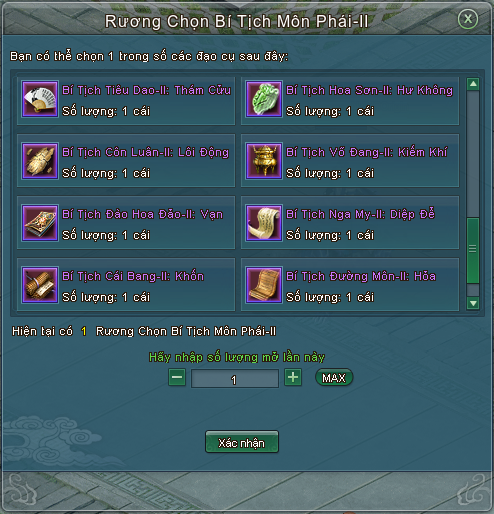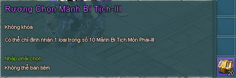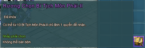- Mở "Rương Chọn Mảnh Bí Tịch-III" để chọn các tàn quyển bí tịch kỹ năng môn phái cấp 100.