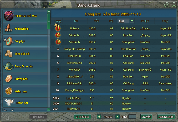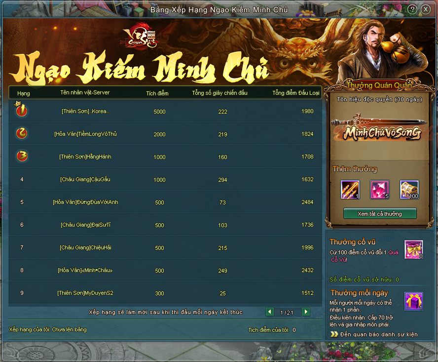 - TOP 70 nhân vật tại Bảng Xếp Hạng Công Lực mỗi máy chủ được nhận Thẻ Ngạo Kiếm Minh Chủ - Mùa 4.